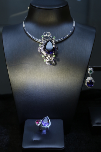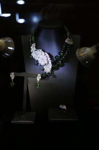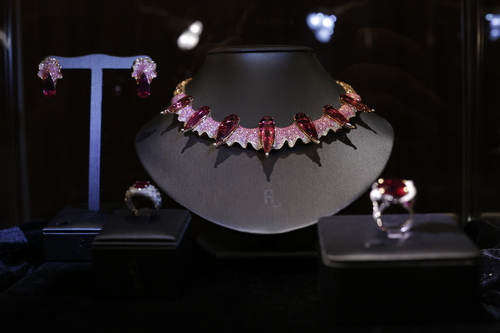 In addition there are nearly two hundred carats of red tourmaline sets of ornaments. 23 of them are pieces of jewelry that have been collected by guests. In addition, there are several new works by Liu Fei, including the 18mm diameter black pearl, tsavorite, diamond set, 6-carat rare top Tsavorite and diamond ring. In this exhibition, Liu Fei hopes to exchange with Chinese media and guests the significance of advanced customization Liu Fei understands, as well as the relationship between jewelry designers, guests and jewelry raw materials.