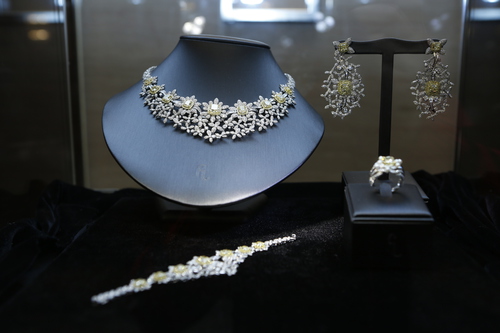 The 40-carat yellow diamond platinum set, a 509-carat Brazilian tourmaline and diamond necklace, valued at 14 million, and the newly unveiled 'Unicorn' diamond necklace by Liu Fei, inspired by a unicorn, The hair is inlaid with bright diamonds, delicate white suet jade and black volcanic stone in stark contrast, the oriental "Rock in Roll" feeling.