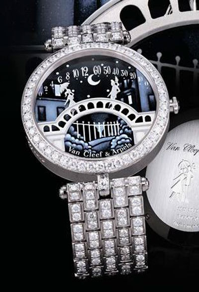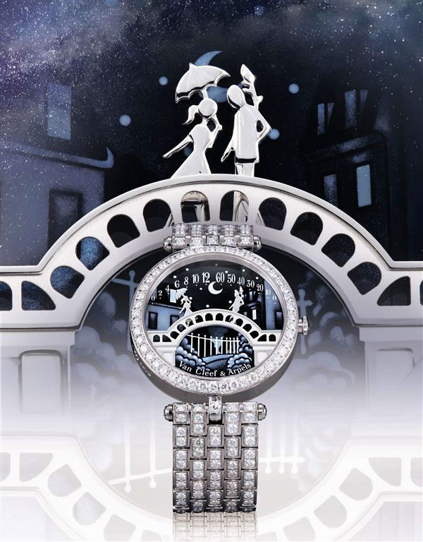 The romantic and poetic Van Cleef & Arpels Poetic complex function watch "Pont des Amoureux ─ ─ Valentine's Bridge" to break the constraints of the watch timekeeping, and put aside the traditional yards and seconds of the yoke, with a dial on his way out of fantasy Love story. Designed to depict the slow pace of a pair of smart dolls, the umbrella lady and her lover elegantly walked on the bridge, slowly passing the passage of time. As the two pulled closer together as time passed, the couple briefly met on the lovers' bridge over the Seine at noon and midnight each day. Set against them, there are beautiful and moving night view of Paris, a bright sky hung in a dazzling Venus, is the location of the Big Bear constellation, but also a symbol of luck.