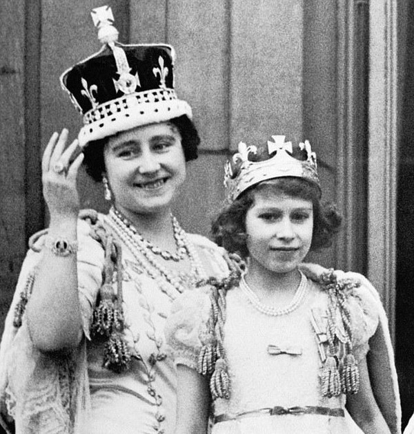 (The photo shows Queen Elizabeth and daughter Elizabeth wearing the crown at the coronation of George V)