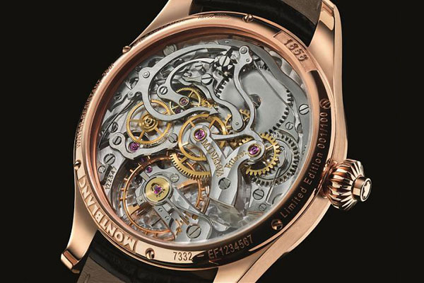 Single chronograph movement MB M16.29 adopt manual winding mechanism with the same size as the pocket watch movement, from the transparent sapphire crystal glass back and back to enjoy the operation of this movement, inspired by Minerva Watch factory original design in 1929 chronograph movement 17.29, and therefore many parts are very similar. Innovative and retro Montblanc 1858 Series Tachymeter Chronograph Limited Edition and the original watch are equipped with the column wheel, chronograph single-button built into the crown, but also from the transparent watch back to enjoy the V-shaped timing plywood Bridge, a technique that has been undermined at the Minerva watch factory since 1912. All the components, including the large-screw balance wheel clamp for fine-tuning (due to its shape, also known as the swan neck), are treated with Geneva ripples and the edges Taken the top of the traditional watchmaking hand-chamfered edge grinding. This typical structure of the horizontal clutch device and the lever supporting the chronograph hammer link, the tail has a small arrow symbol Minerva watch factory, all the assembly, adjustment and surface treatment processes are completed in the Montblanc factory hand-painted, the ultimate classic The device complies with the industry's highest quality standards and contains 252 parts, 6.3mm high, vibrating up to 18,000 vibrations per hour, providing a heart-like vibrational frequency that provides 50 hours of power reserve.