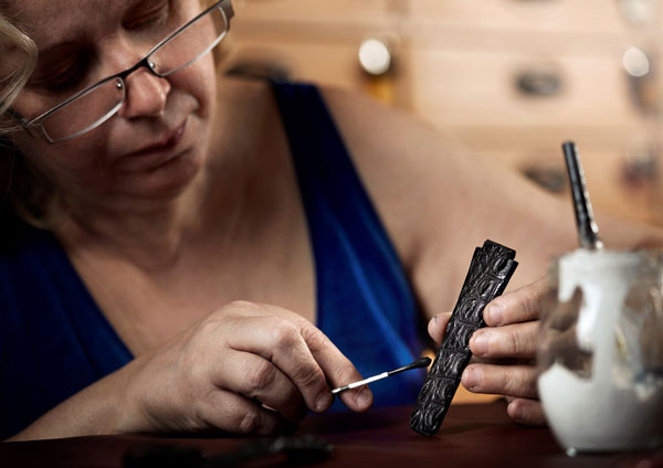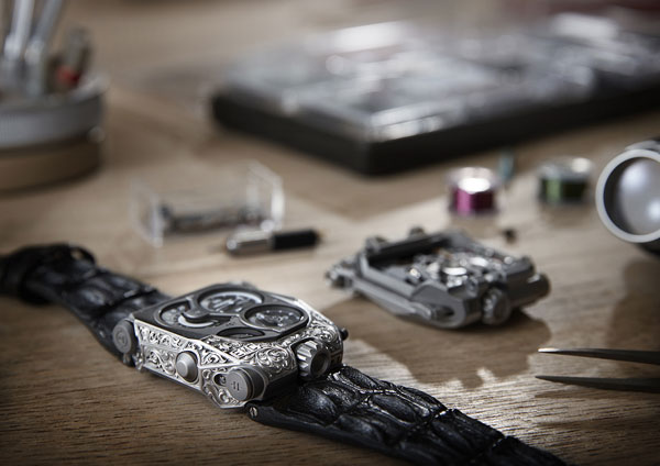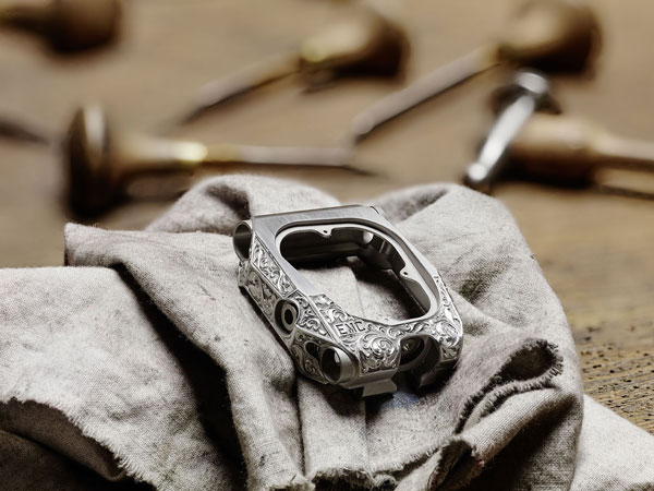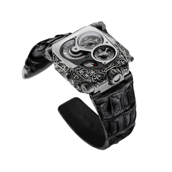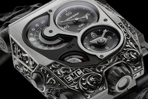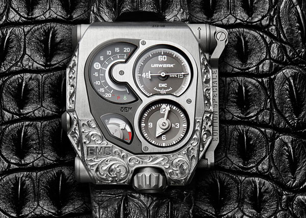 Urwerk put on a unique new dress for this unique EMC Pistol, unlike the sleek front case, the new case is covered with hand-carved curly leaf pattern, the design of the watch as a whole very forward-thinking design Into the traditional decorative patterns of gold carving, in addition to the watch strap specially selected crocodile back with raised leather parts of the site, the moment the traditional craft of the wonderful infusion in the science and technology significant system, to create a Kind of conflict-like kind of beauty.